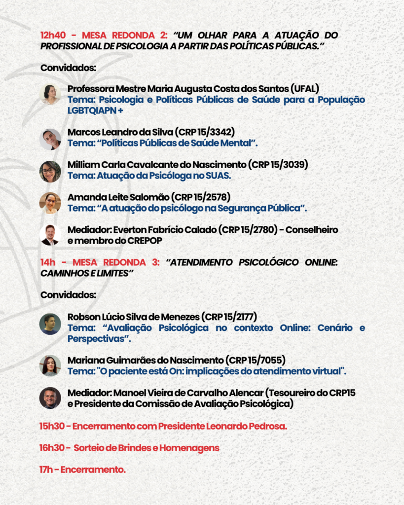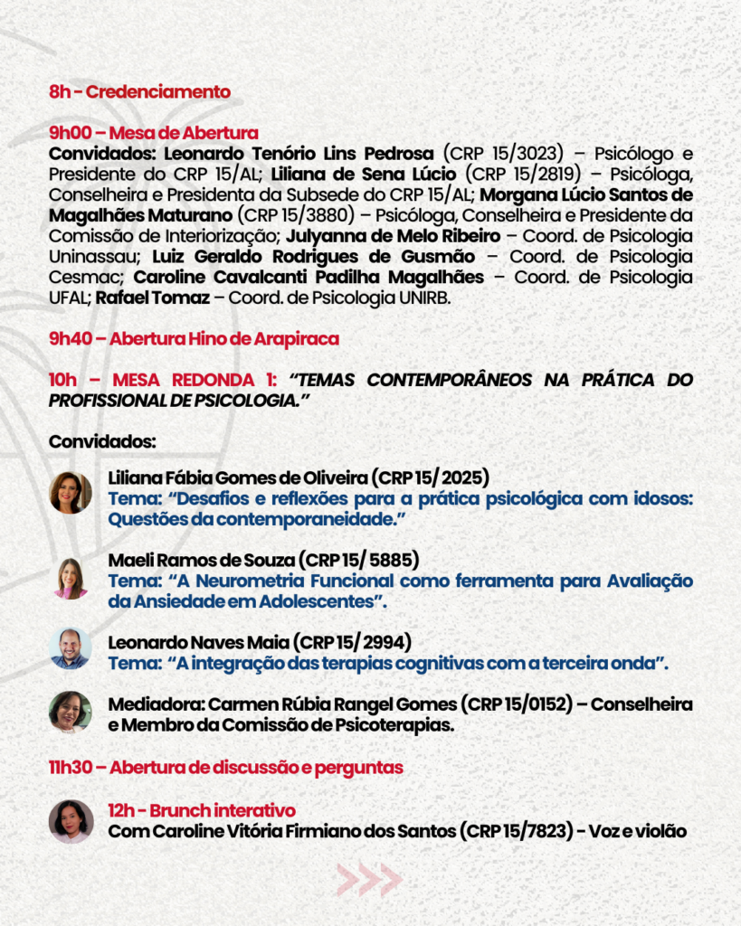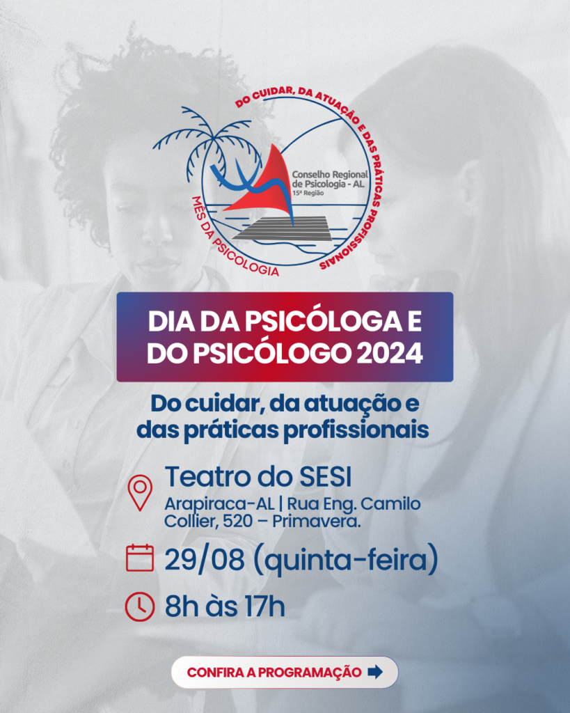 No dia 29/08 (quinta-feira), das 8h às 17h, o CRP15 promove um evento especial no Teatro do SESI, em Arapiraca/AL, com o tema “Do cuidar, da atuação e das práticas profissionais.”