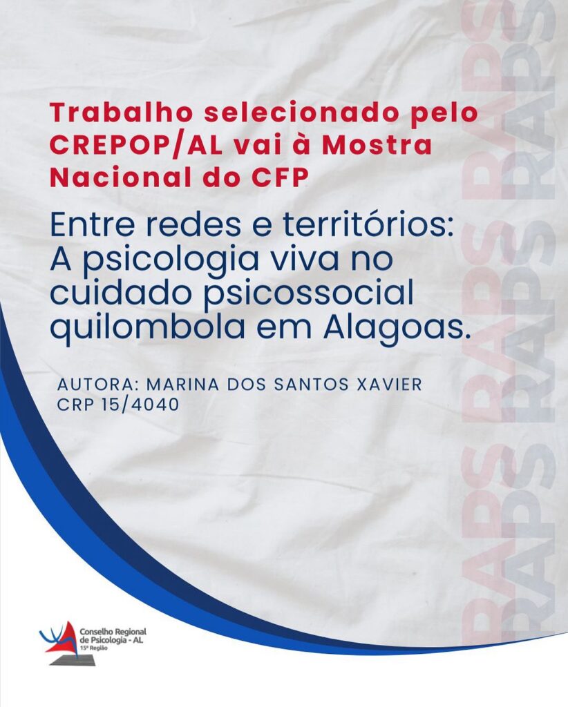 Considerando os três trabalhos recebidos pelo regional, o texto “Entre redes e territórios: A psicologia viva no cuidado psicossocial quilombola em Alagoas”, de autoria da psicóloga Marina dos Santos Xavier CRP15/4040, foi selecionado mediante critérios estabelecidos no edital do CFP pela equipe do CREPOP/AL.
