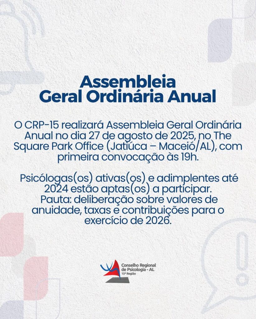 O Conselho Regional de Psicologia da 15ª Região informa que realizará Assembleia Geral Ordinária Anual no dia 27 de agosto de 2025, às 19h (1ª convocação) e 19h30 (2ª convocação), no The Square Park Office, em Maceió/AL.