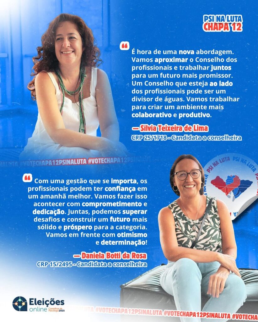 #paratodosverem : Card com fundo azul-marinho, com o logotipo da Chapa 12 – Psi na Luta no canto superior direito. Abaixo, à esquerda, foto da psicóloga e professora Daniela Botti. À direita, frase com sua assinatura. Mais abaixo, à direita, foto da também psicóloga e professora Sílvia Teixeira, acompanhada de frase de sua autoria, à esquerda. As letras são brancas, com aspas em vermelho. Daniela é uma mulher branca, usa um vestido branco e sorri. Sílvia é uma mulher parda, usa uma blusa verde estampada com imagens de folhas em cor clara e também sorri. As duas estão sentadas.
