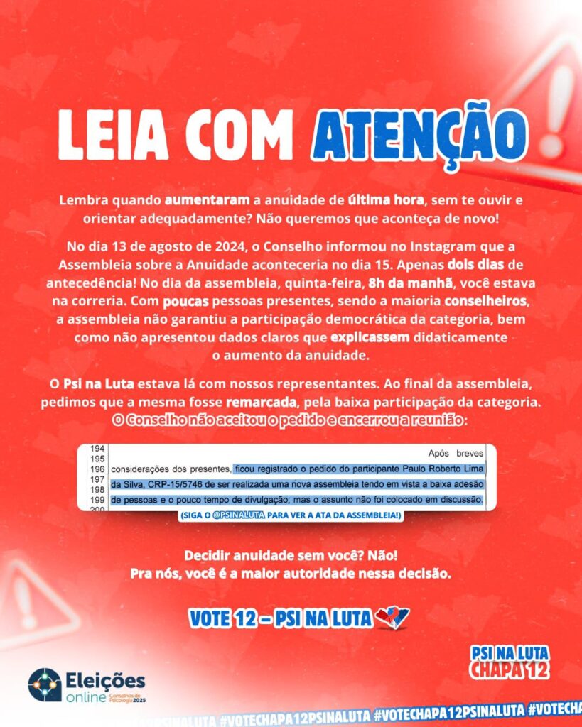 Com a gente, a Assembleia da Anuidade vai ser amplamente divulgada com, pelo menos, dois meses de antecedência e vai acontecer em horário possível pra você participar.