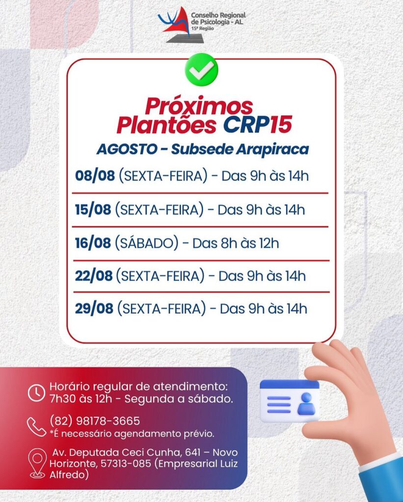 Confira os plantões presenciais de agosto na subsede do CRP15:
