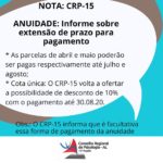 Olá, psicólogas e psicólogos. Como forma de minimizar os transtorno pelo COVID-19 (coronavírus), o Conselho Regional de Psicologia (CRP-15) decidiu ampliar a possibilidade do prazo de pagamento da anuidade 2020: … Continue lendo