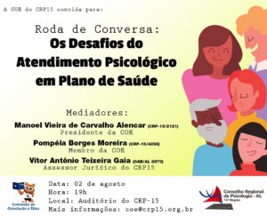 No dia 02 de agosto o Conselho Regional de Psicologia, através da Comissão de Orientação e Ética (COE) e da Assessoria Jurídica vai realizar uma roda de conversa, às 19h, no auditório do CRP-15 com o tema: “Os Desafios do Atendimento Psicológico em Plano de Saúde”.