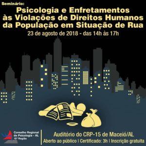 Maceió é palco de diversas violências e violações de direitos desse público, havendo um massacre que vem sendo noticiado desde 2010. Por isso, o Grupo de Trabalho sobre População em situação de rua da Comissão de Direitos Humanos do Conselho Regional de Psicologia de Alagoas (CRP/15) convoca ao debate público psicólogos, assistentes sociais, advogados, estudantes, movimentos sociais, pesquisadores e professores, pessoas em situação de rua para compor no dia 23 de agosto de 2018 o I Seminário Psicologia e enfrentamentos às violações de direitos humanos da População em situação de rua, que acontecerá das 14h às 17h, no auditório do Conselho.