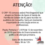Olá, Psicólogas e Psicólogos do Estado de Alagoas. O Conselho Regional de Psicologia (CRP-15) convoca as(os) Psicólogas(os) que atuam no Núcleo Ampliado de Saúde da Família e Atenção Básica (Nasf-Ab) … Continue lendo